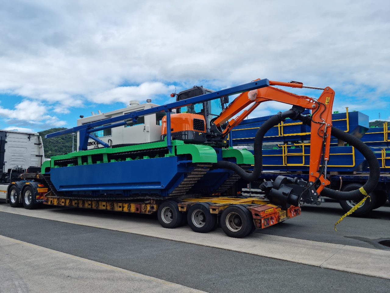 백건준설이 자체 제작한 다목적 수륙양용 준설선의 컴팩트형 장비입니다.
